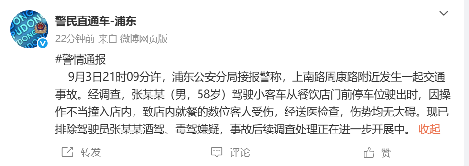 9月4日,上海市公安局浦东分局官方微博“警民直通车-浦东”发布警情通报:9月3日21时09分许,浦东公安分局接报警称,上南路周康路附近发生一起交通事故。经调查,张某某(男,58岁)驾驶小客车从餐饮店门前停车位驶出时,因操作不当撞入店内,致店内就餐的数位客人受伤,经送医检查,伤势均无大碍。现已排除驾驶员张某某酒驾、毒驾嫌疑,事故后续调查处理正在进一步开展中。